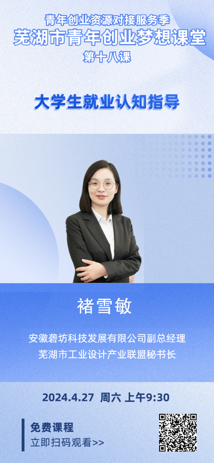 4月27日上午,“源來好創(chuàng)業(yè)”青年創(chuàng)業(yè)資源對(duì)接服務(wù)季——蕪湖市青年創(chuàng)業(yè)夢(mèng)想課堂第十八課正式播出。本次是由安徽礱坊科技發(fā)展有限公司副總經(jīng)理,蕪湖市工業(yè)設(shè)計(jì)產(chǎn)業(yè)聯(lián)盟秘書長(zhǎng)褚雪敏帶來的《大學(xué)生就業(yè)認(rèn)知指導(dǎo)》課程。